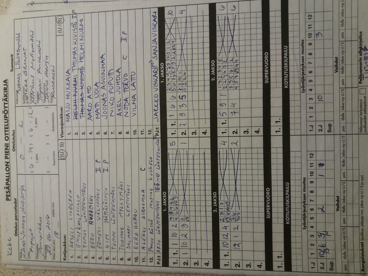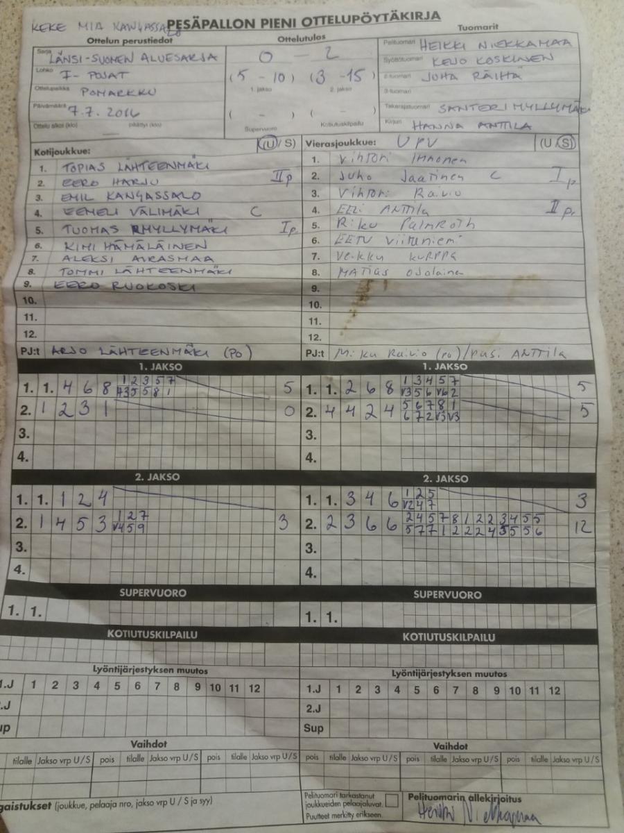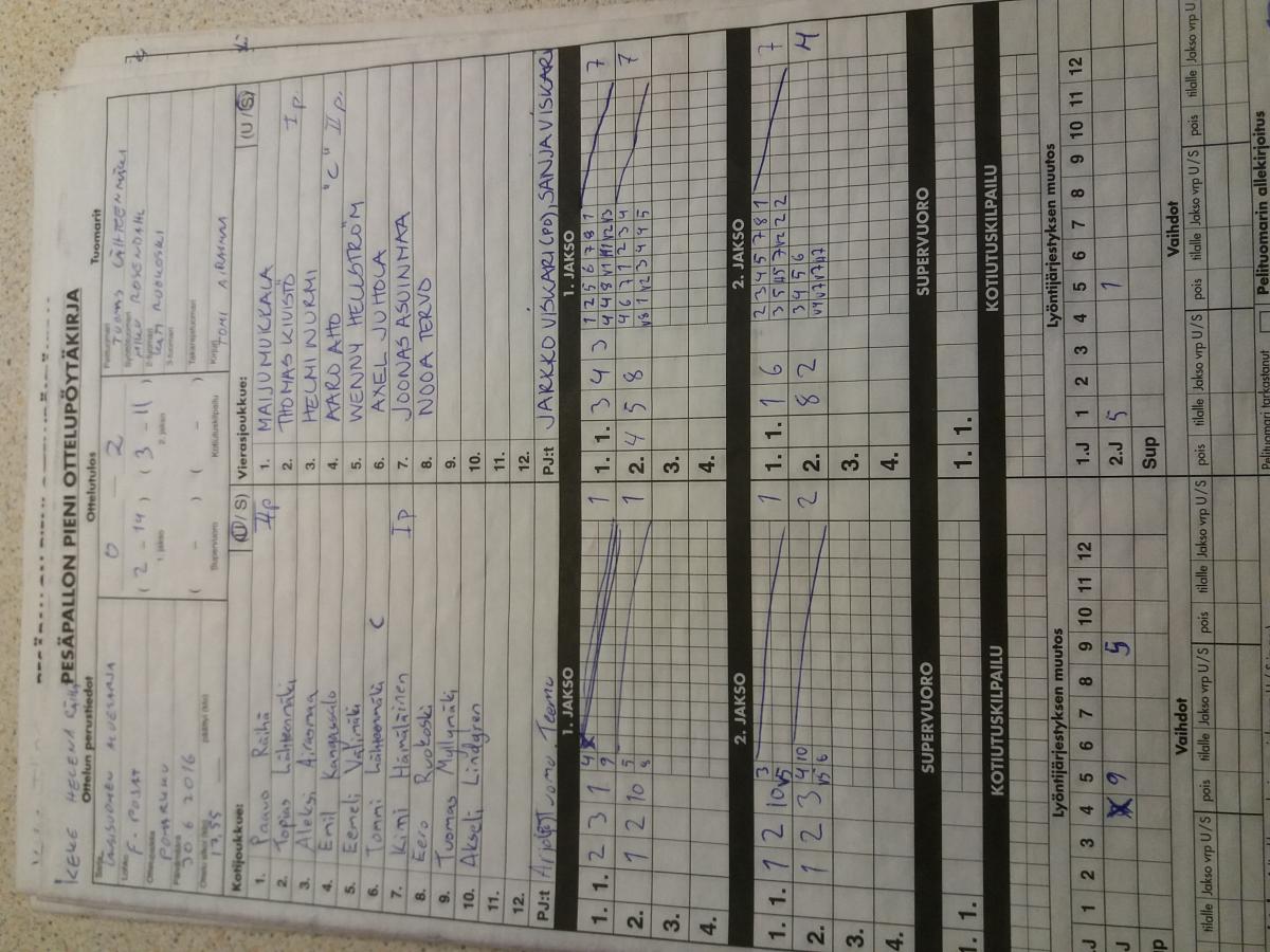 | 18.8.2016 18:00 | PomPy F-pojat | UP-V F-pojat | 0-2 (6-18, 3-12) | ||