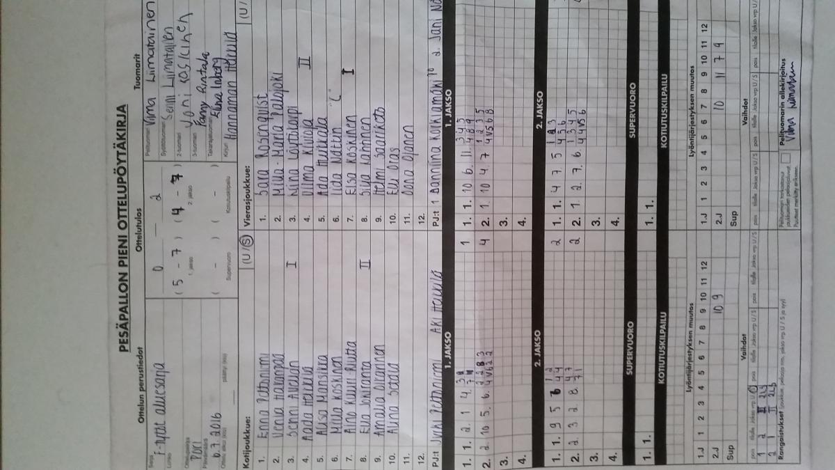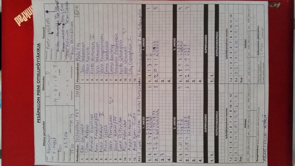 | 28.7.2016 18:00 | Pesäkarhut F07 | UP-V F-tytöt | 2-0 (13-4, 6-5) | näytä | |