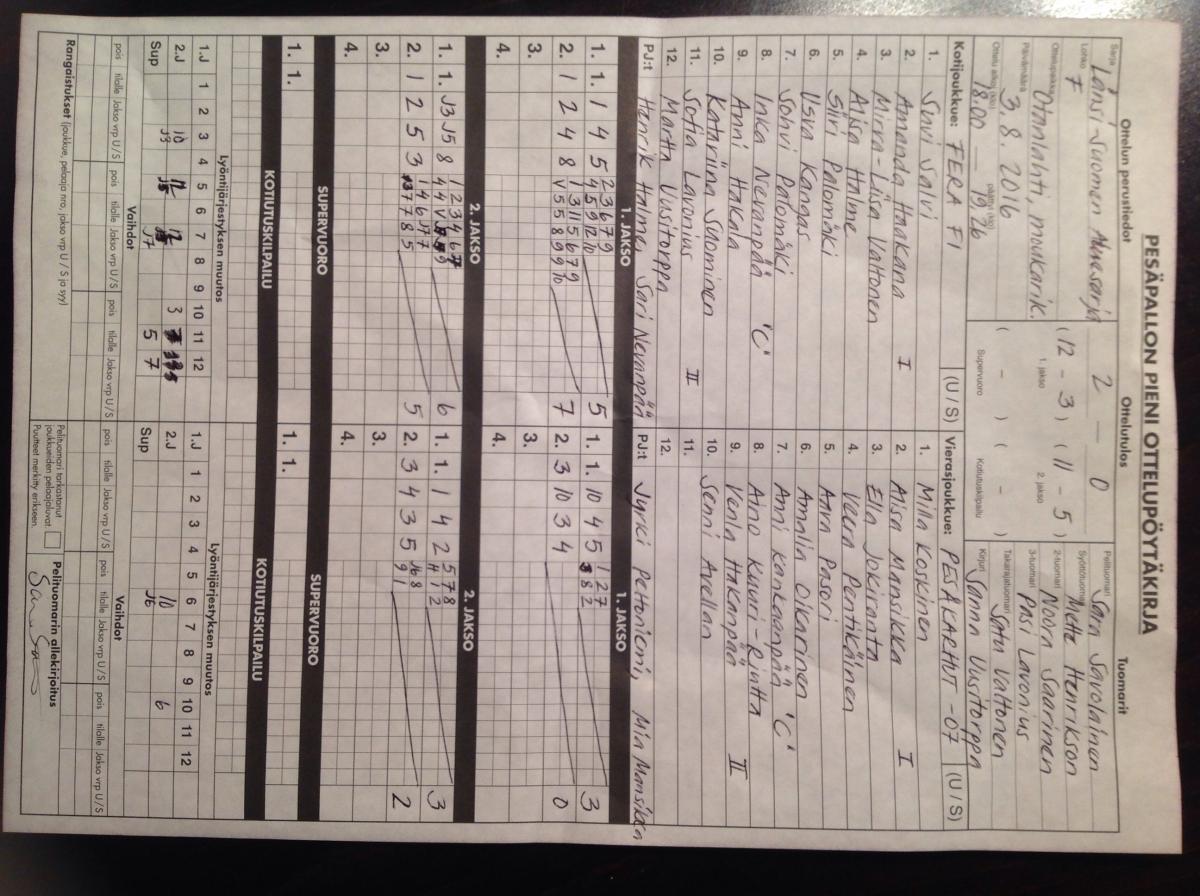 | 24.8.2016 18:00 | LaJy | Pesäkarhut F07 | 2-0 (16-6, 10-6) |