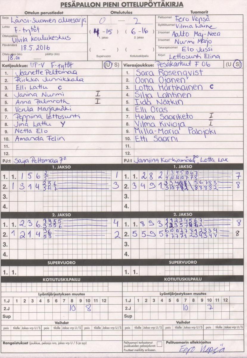 | 11.5.2016 18:00 | Pesäkarhut F06 | UP-V F-tytöt | 2-0 (13-6, 22-2) | ||