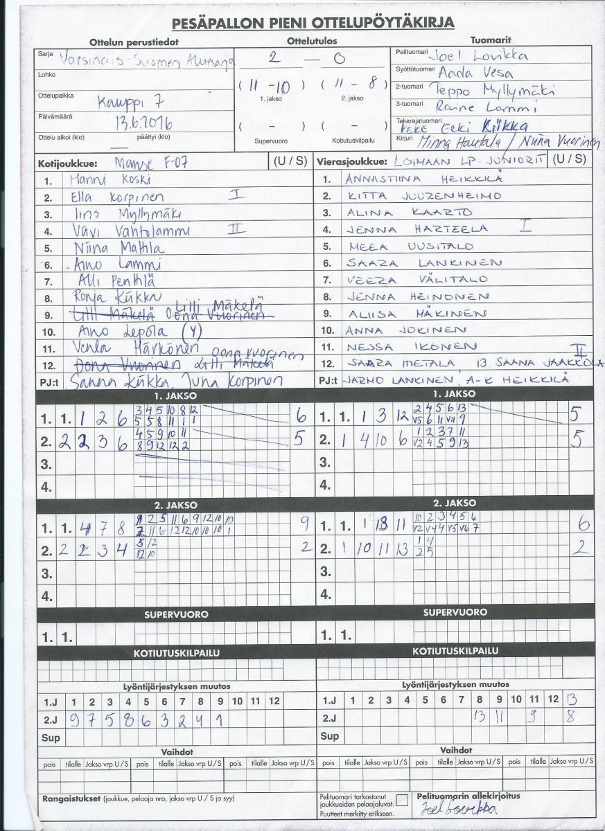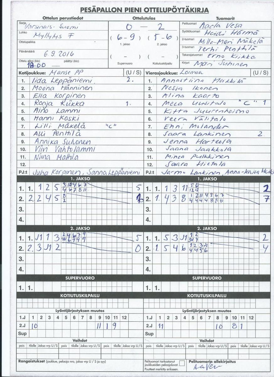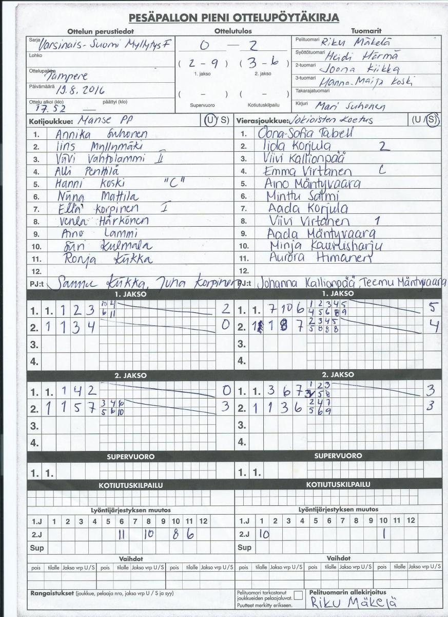 | 8.8.2016 | Mynämäki | Tampere | 0-1 (11-13, 6-6) | ||