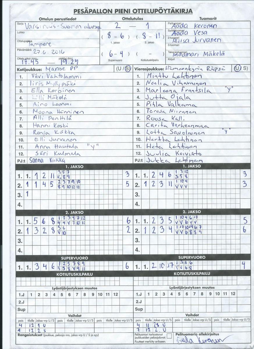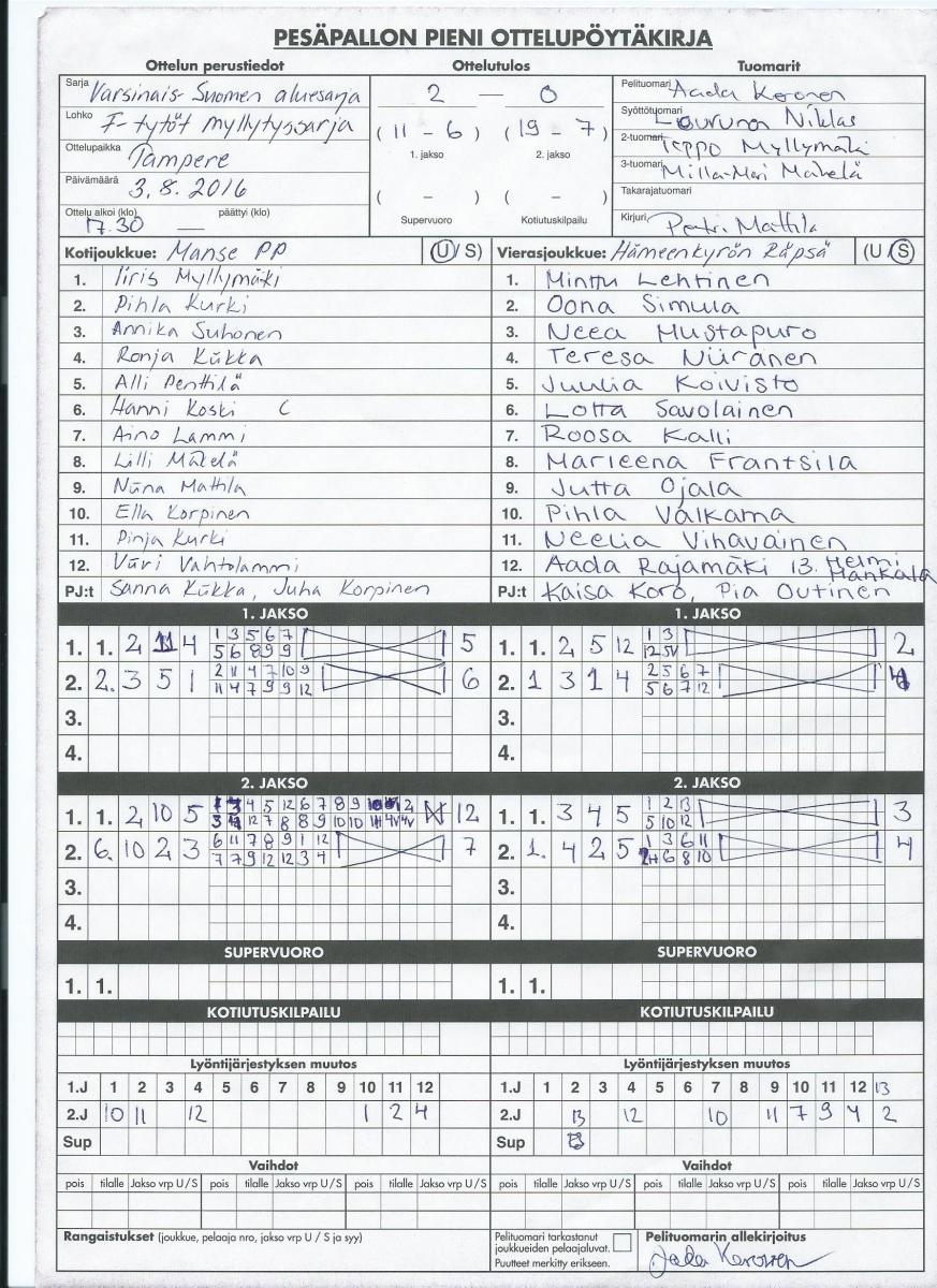 | 3.8.2016 | Tampere | Hämeenkyrö | 2-0 (11-6, 19-7) | näytä | |