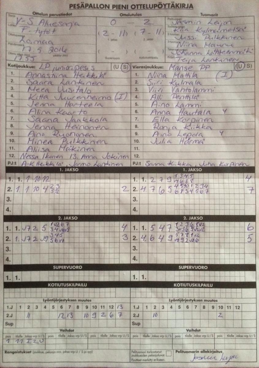 | 22.8.2016 | Hämeenkyrö | Tampere | 1-2 (8-11, 9-8, 4-7) | ||
