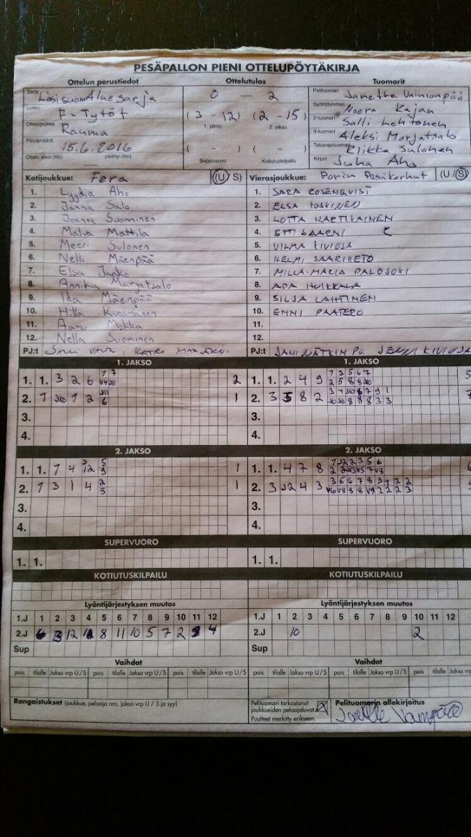 | 15.6.2016 18:00 | fera f2 | Pesäkarhut F06 | 0-2 (3-12, 2-15) | näytä | |
