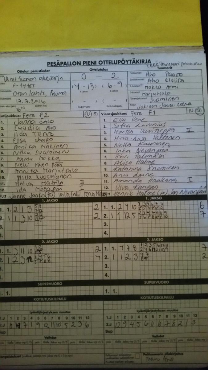 | 4.5.2016 18:00 | fera f2 | LaJy | 0-2 (4-9, 3-10) | näytä | |