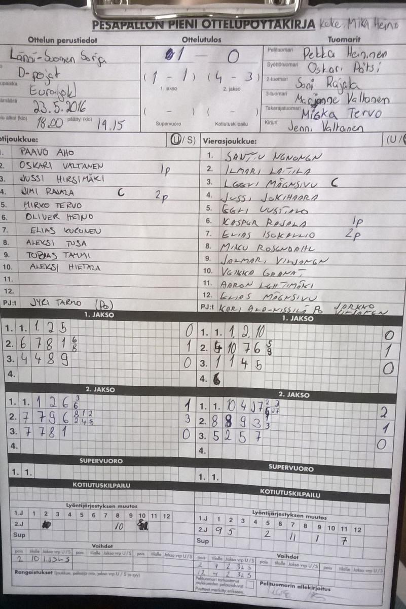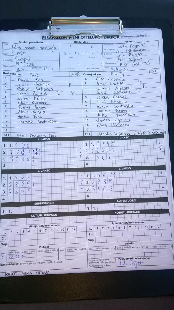| 1.8.2016 18:00 | PomPy D-pojat | EuVe | 1-0 (4-4, 6-3) | ||