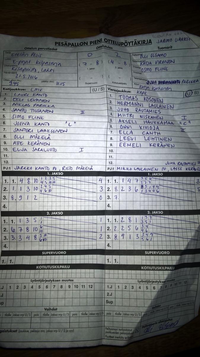 | 29.5.2016 | Kepe E-pojat | Kipe06 EP1 | 0-2 (3-21, 6-9) | näytä | |