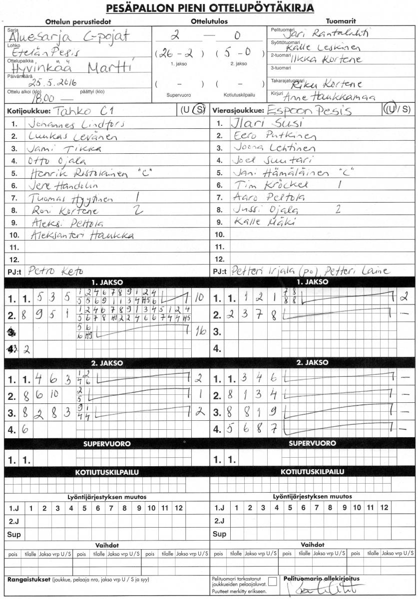 | 25.5.2016 | Tahko1 P00 | Espoon Pesis | 2-0 (26-2, 5-0) | näytä | |