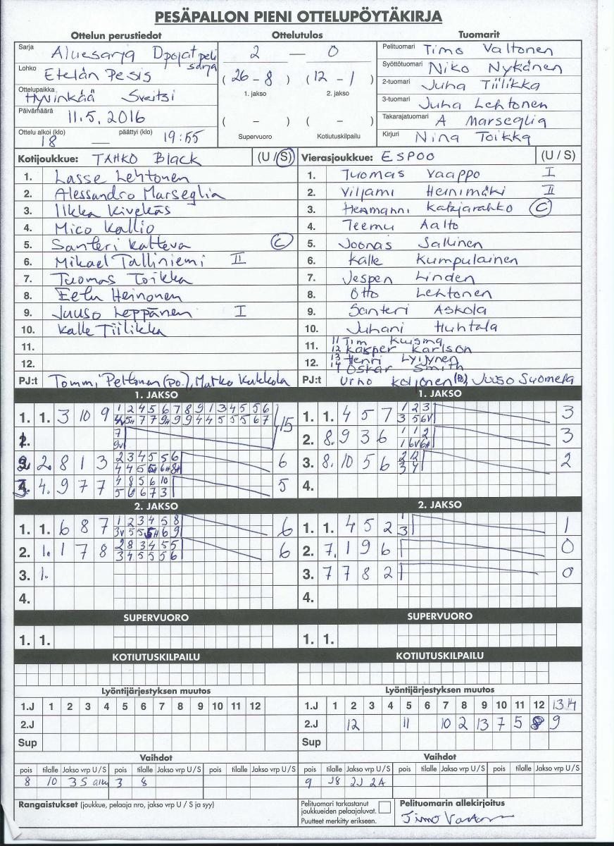 | 11.5.2016 | Tahko Black | Espoo DP | 2-0 (26-8, 12-1) | näytä | |