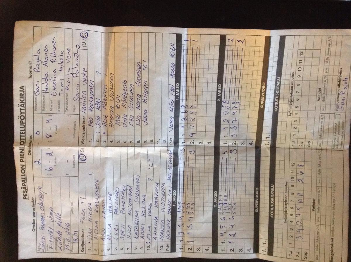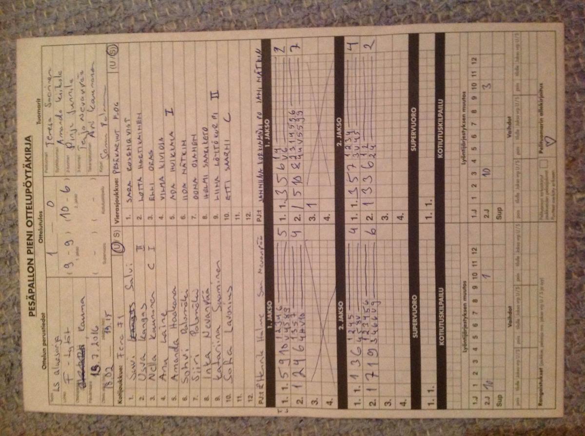| 27.7.2016 18:00 | Fera F1 | UP-V F-tytöt | 2-0 (18-2, 24-4) | näytä | |
