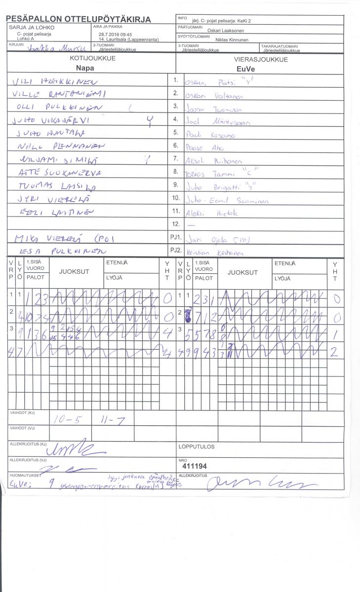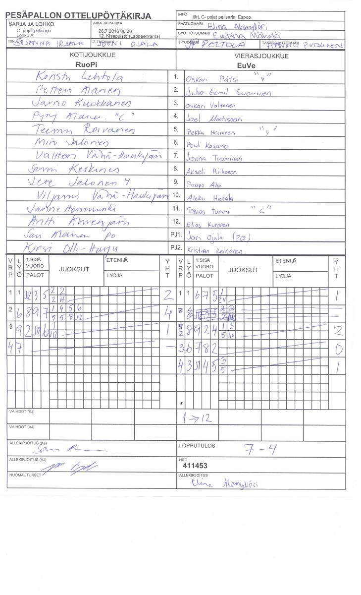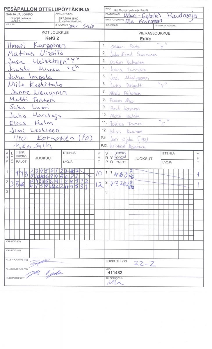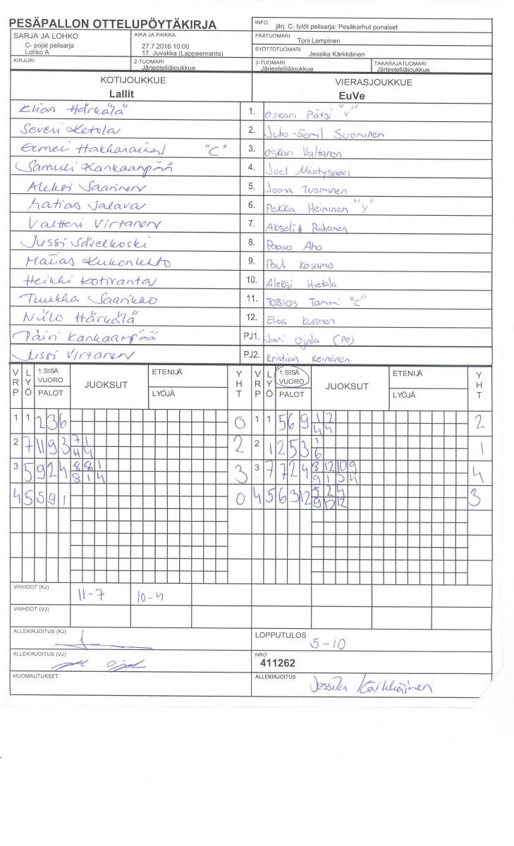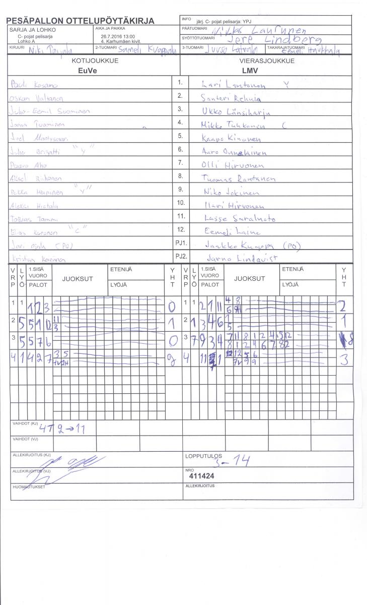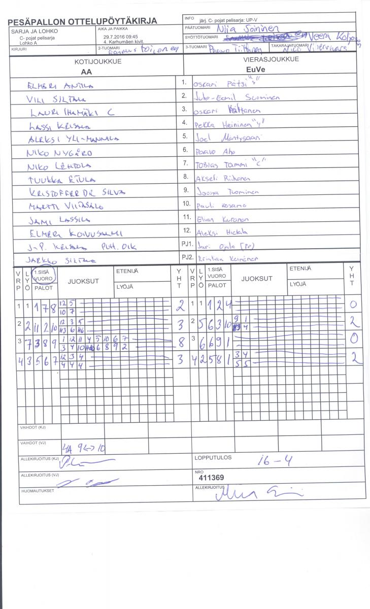 | C- pojat pelisarja - Lohko A | 29.7.2016 11:00 | 4. Karhumäen kivit. | LMV | Lallit | EuVe |