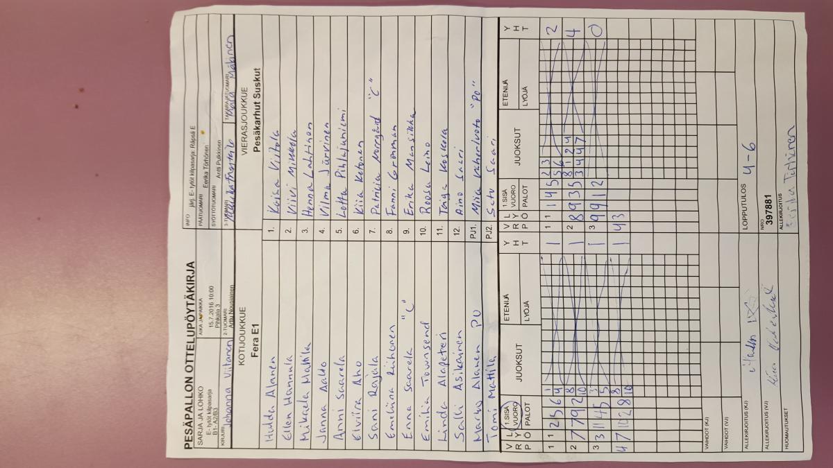 | E- tytöt kilpasarja - Lohko B | 11.7.2016 14:00 | Villa Park 2 | JoMa ET | NJ-04 | Fera E1 |