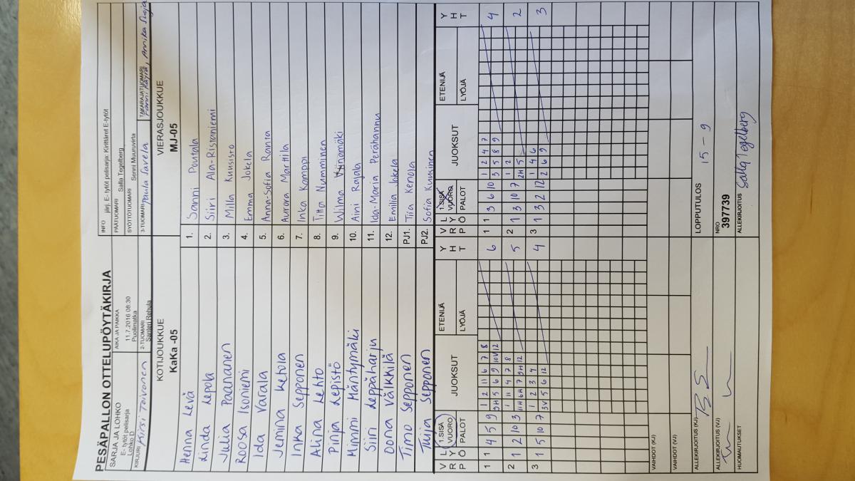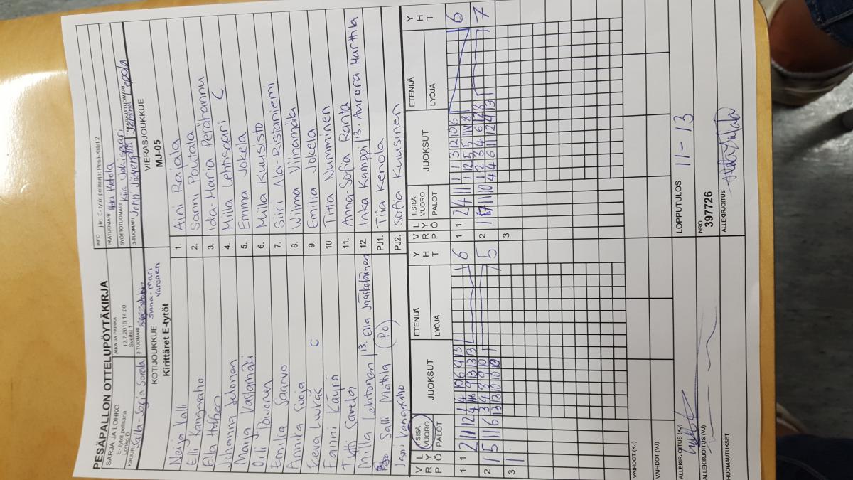 | Jatkolohko K | 13.7.2016 15:00 | Kankuri 1 | SiiPe ET -05 | Kirittäret E-tytöt | MJ-05 |