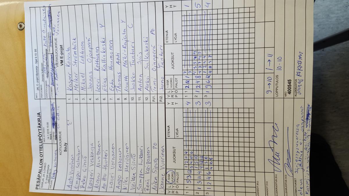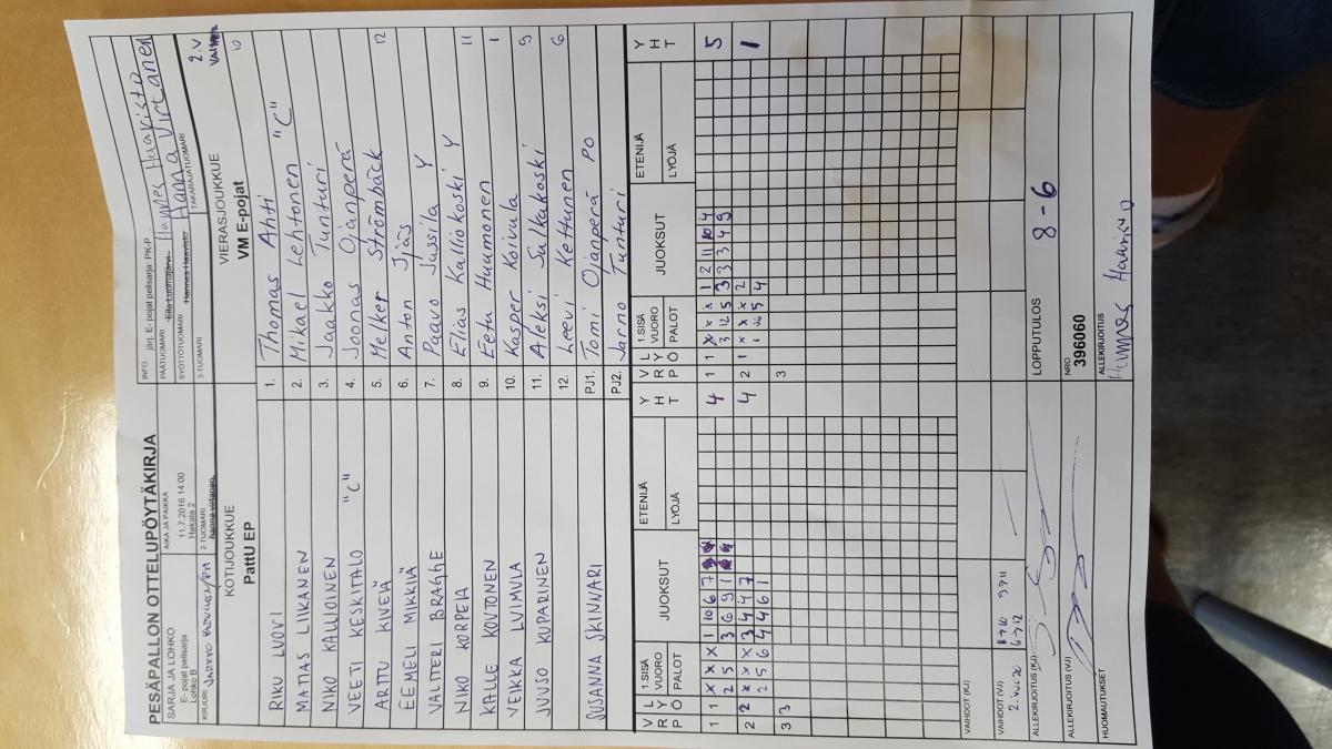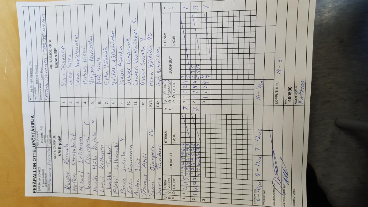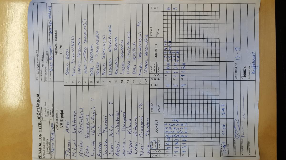| E- pojat pelisarja - Lohko C | 12.7.2016 14:00 | Vehkoja | PK-P | Tahko Yellow | VM E-pojat |