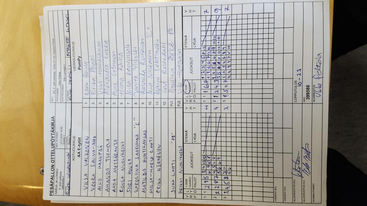 | Jatkolohko I | 14.7.2016 09:00 | Sveitsi 1 | SMJ-T04 | PomPy | AA E-tytöt |