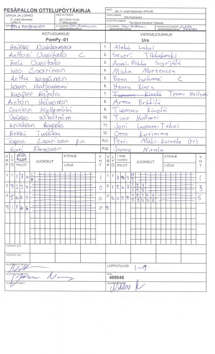 | C- pojat kilpasarja - Lohko A | 26.7.2016 18:00 | 11. Vanha kenttä (Lappeenranta) | Ysit black | Ura | PomPy -01 |