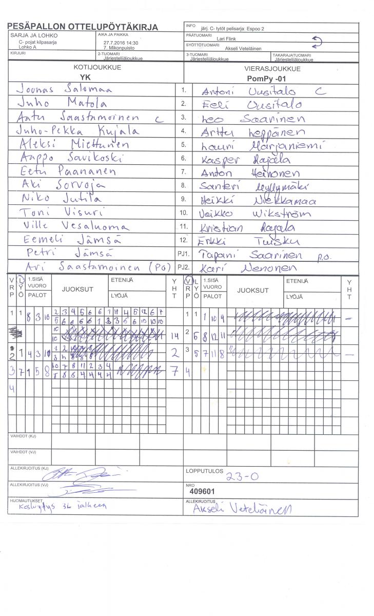 | 27.7.2016 14:30 | 7. Mikonpuisto | YK | PomPy -01 | 23-0 | näytä |