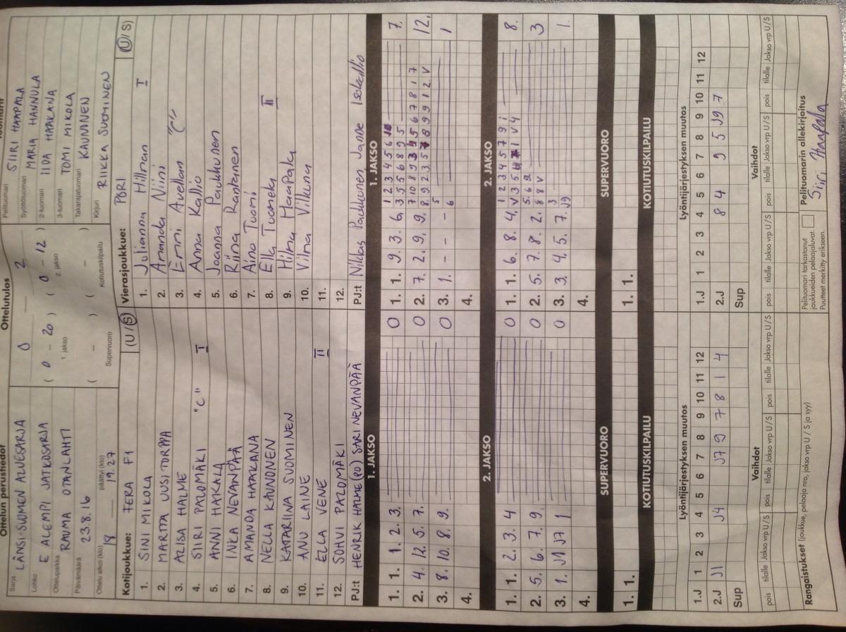 | 6.9.2016 18:00 | Carrut Pori | KK-V E-tytöt | 2-0 (17-4, 20-0) |