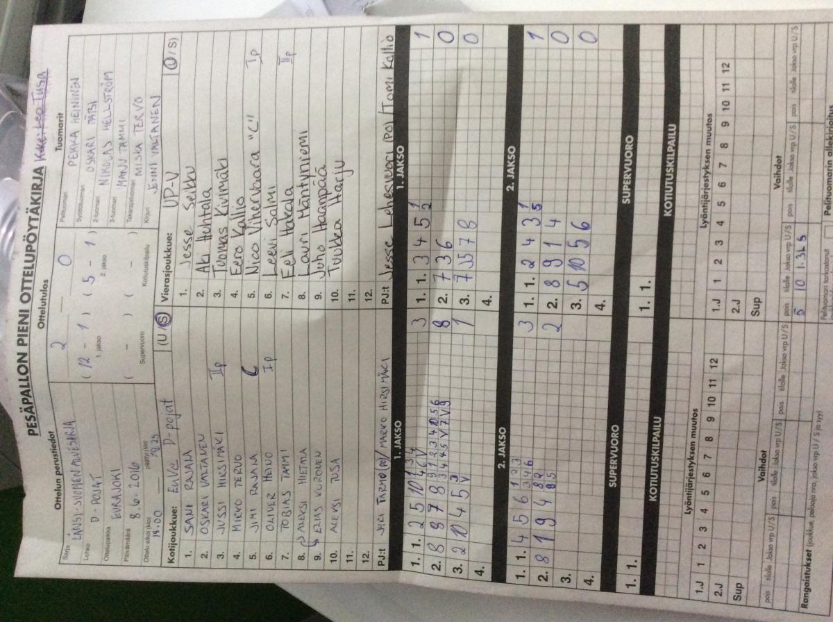 | 30.6.2016 18:00 | UP-V D- pojat | KaMa | 0-2 (1-6, 2-16) | ||
