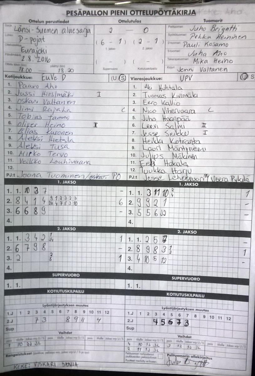 | 2.8.2016 18:00 | EuVe | UP-V D- pojat | 2-0 (6-1, 2-1) | näytä | |