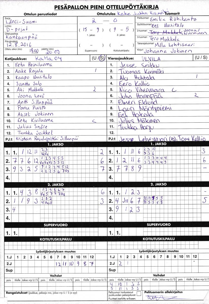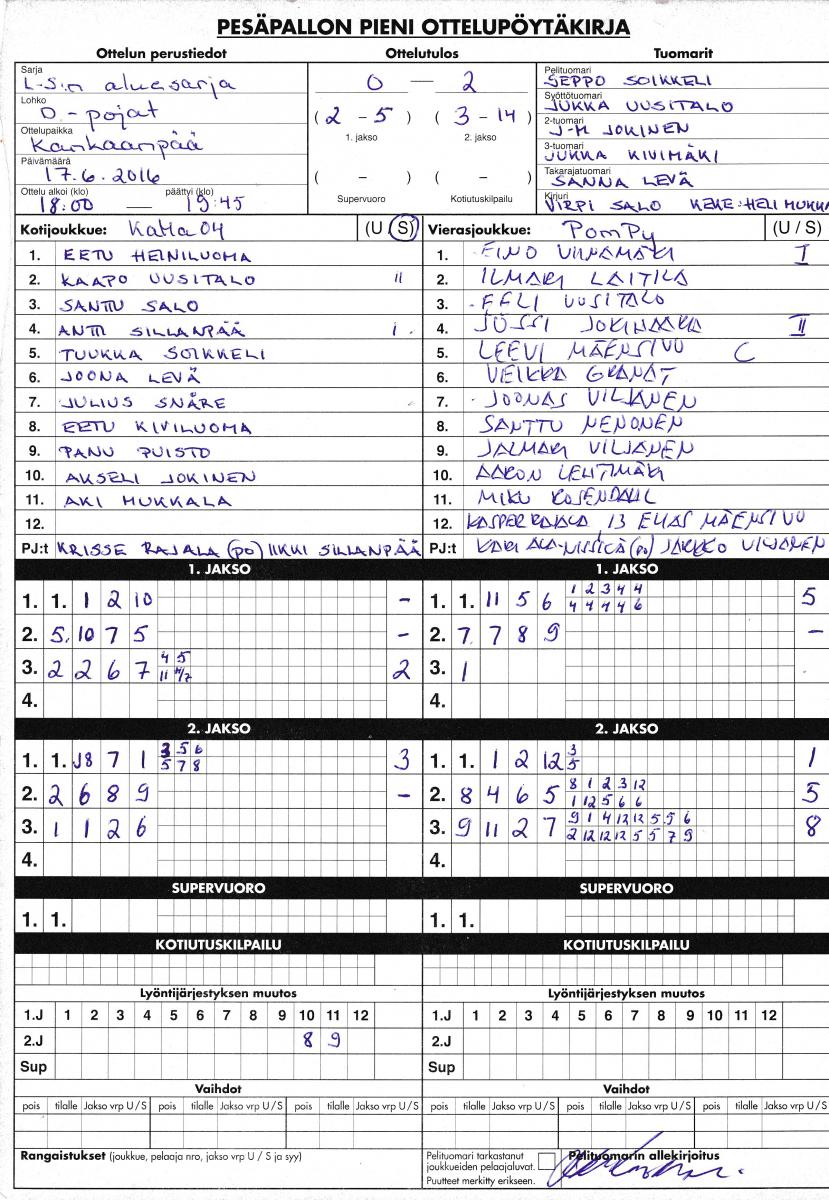 | 2.8.2016 18:00 | PomPy D-pojat | KaMa -04 pojat | 2-1 (8-4, 3-7, 0-0, 2-1) | ||