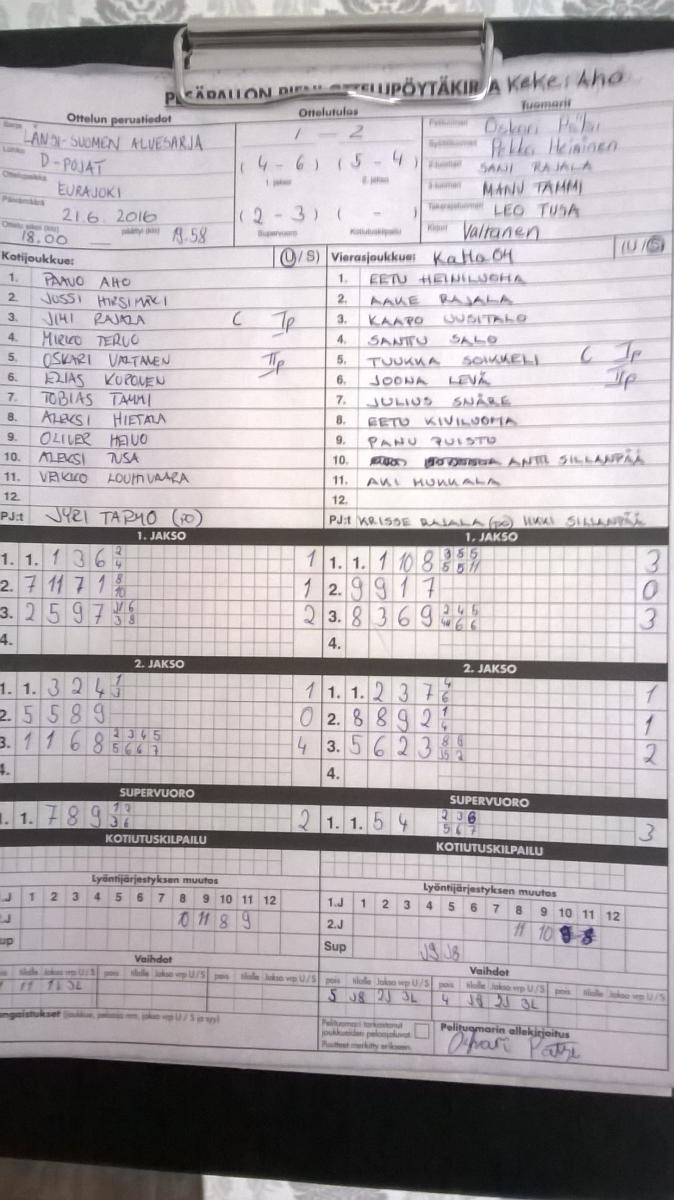 | 21.6.2016 18:00 | EuVe | KaMa -04 pojat | 1-2 (4-6, 5-4, 2-3) | näytä | |