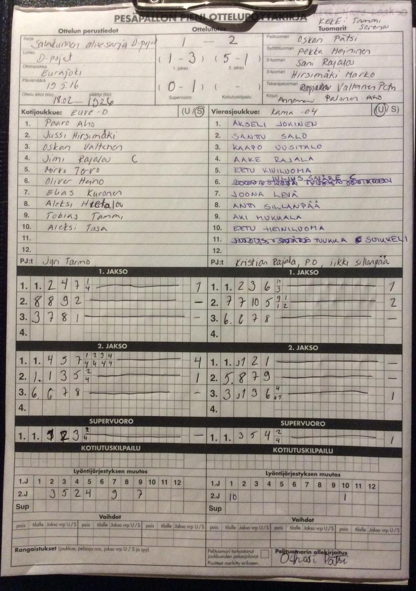 | 5.8.2016 18:00 | KaMa -04 pojat | EuVe | 2-1 (5-3, 5-8, 3-2) | ||