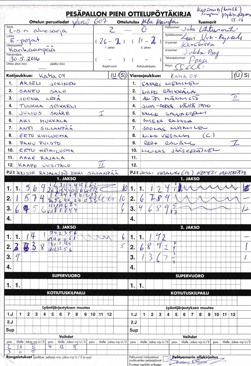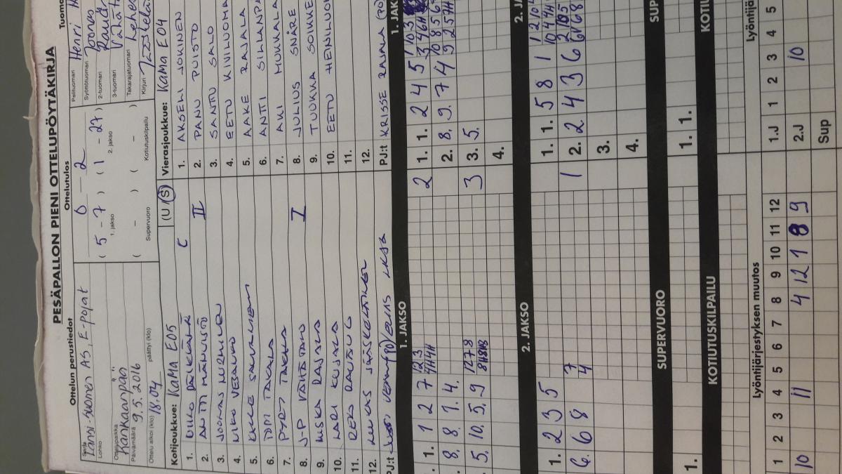 | 9.5.2016 18:00 | KaMa E-05 | KaMa E-04 pojat | 0-2 (5-7, 1-27) | näytä | |