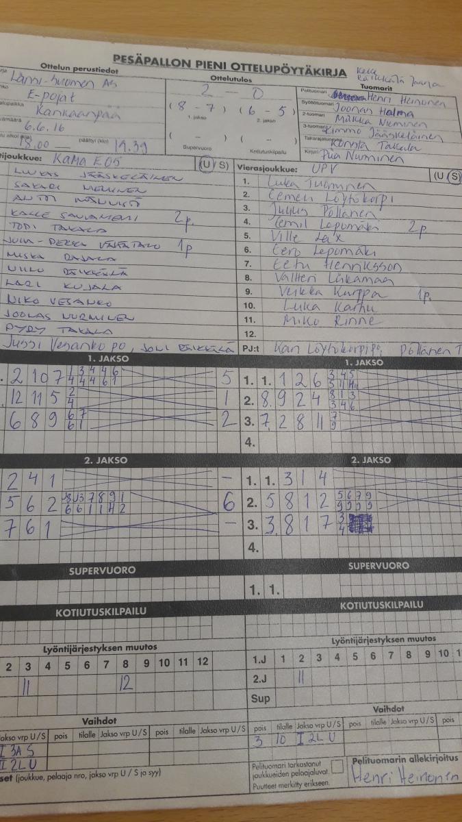 | 1.8.2016 18:00 | UP-V E | EuVe E | 2-0 (11-0, 26-9) | näytä | |