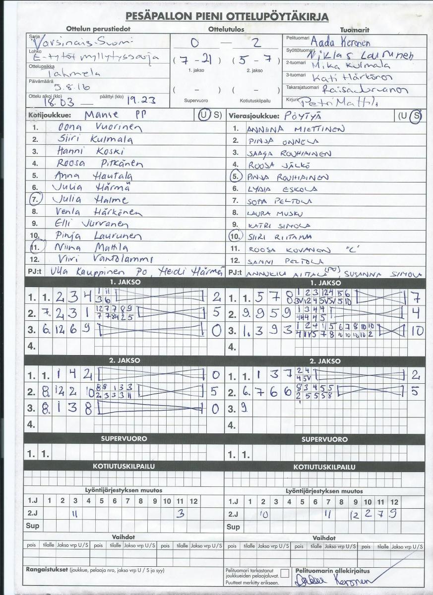 | 5.8.2016 | Tampere | Pöytyä | 0-2 (7-21, 5-7) | näytä | |