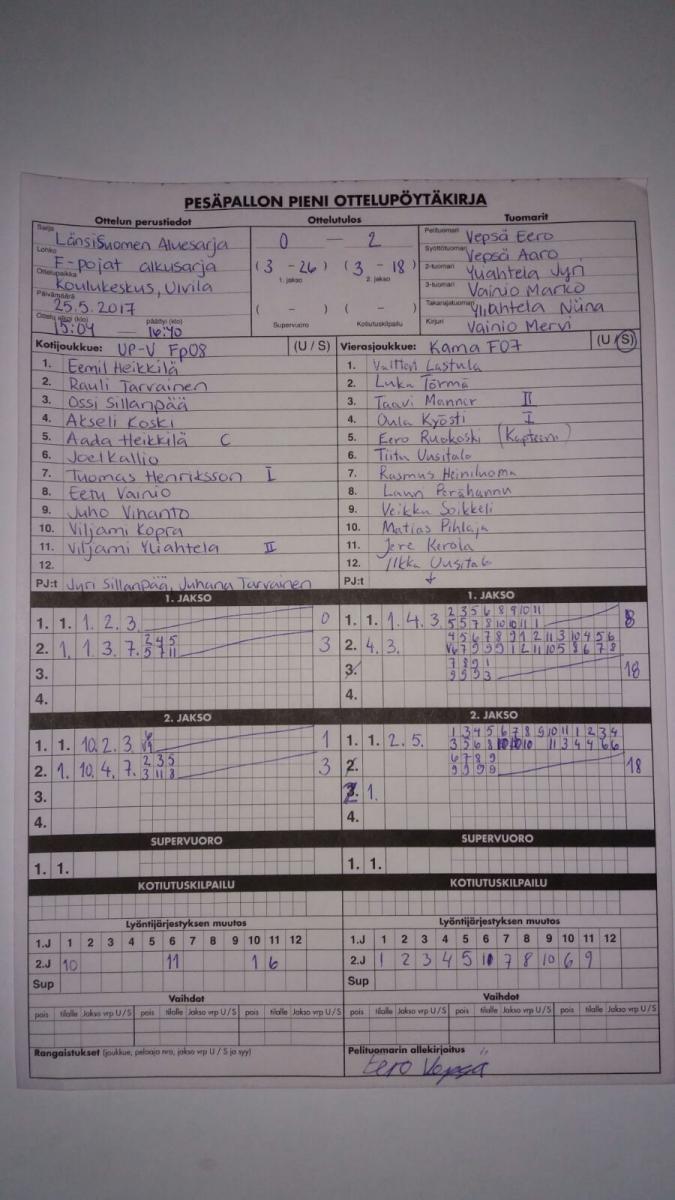 | 25.5.2017 15:00 | UP-V F08 -pojat | KaMa F-07 | 0-2 (3-26, 3-18) | näytä | |