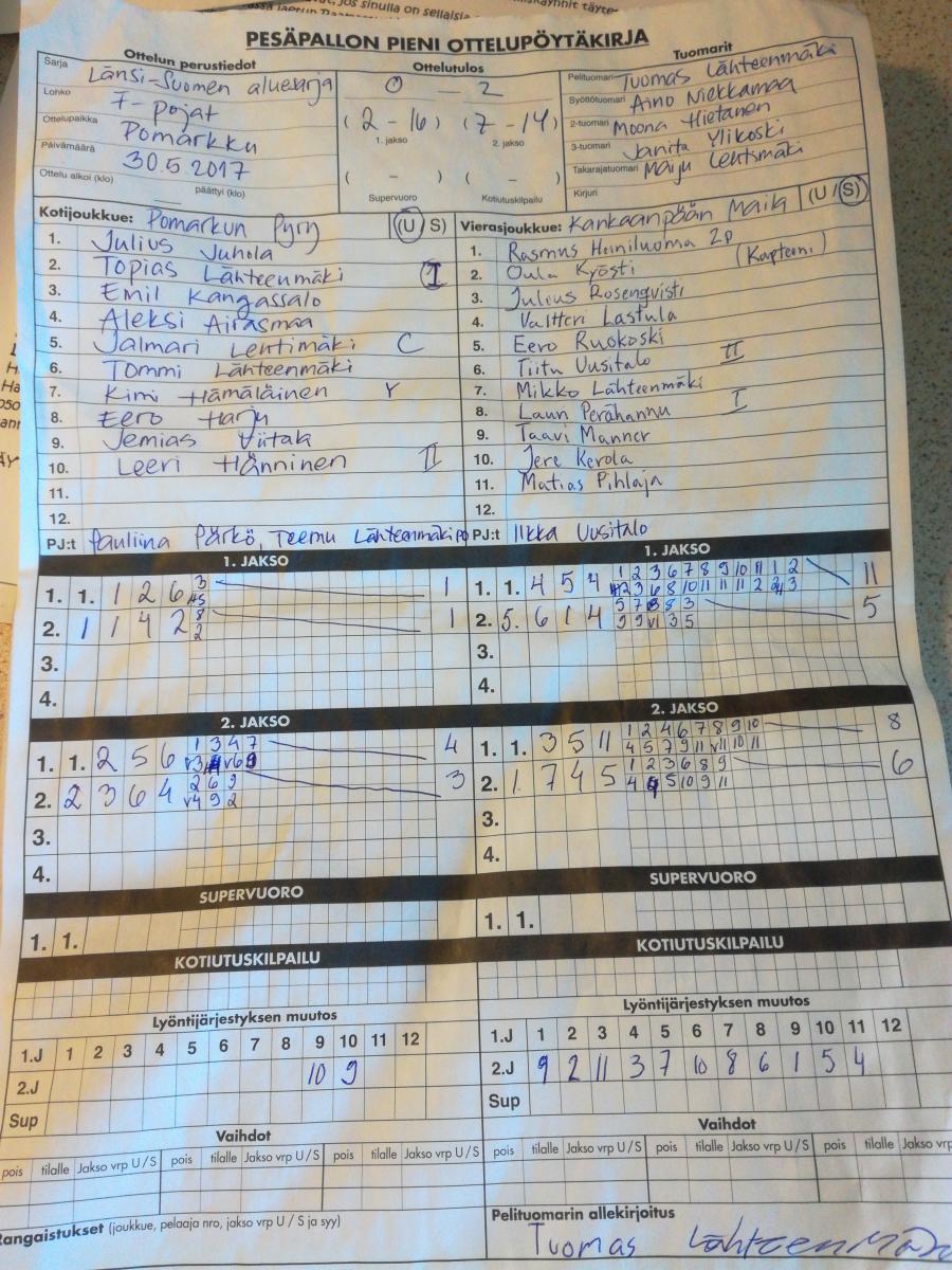 | 30.5.2017 18:00 | PomPy F-pojat | KaMa F-07 | 0-2 (2-16, 7-14) | näytä | |