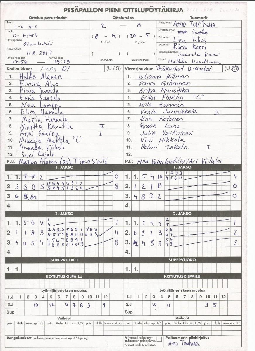 | 11.8.2017 18:00 | Fera D1 | Pesäkarhut D-mustat | 2-0 (8-4, 20-5) | näytä |
