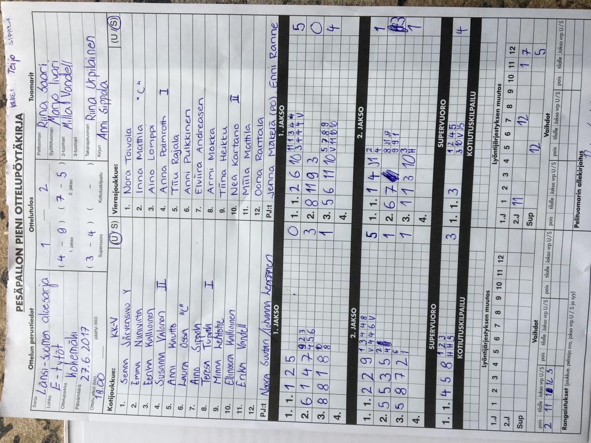 | 27.6.2017 18:00 | KK-V E-tytöt | Fera E1 | 1-2 (4-9, 7-5, 3-4) | näytä | |