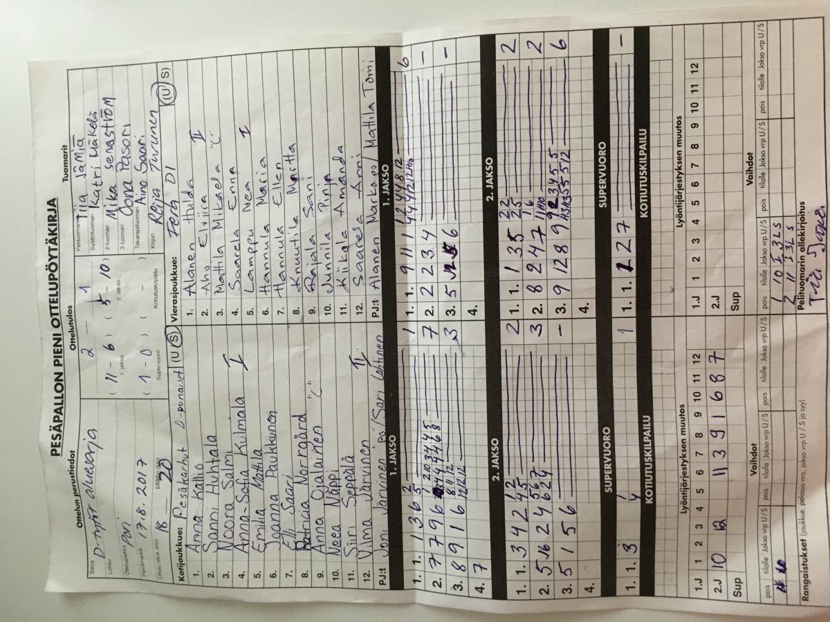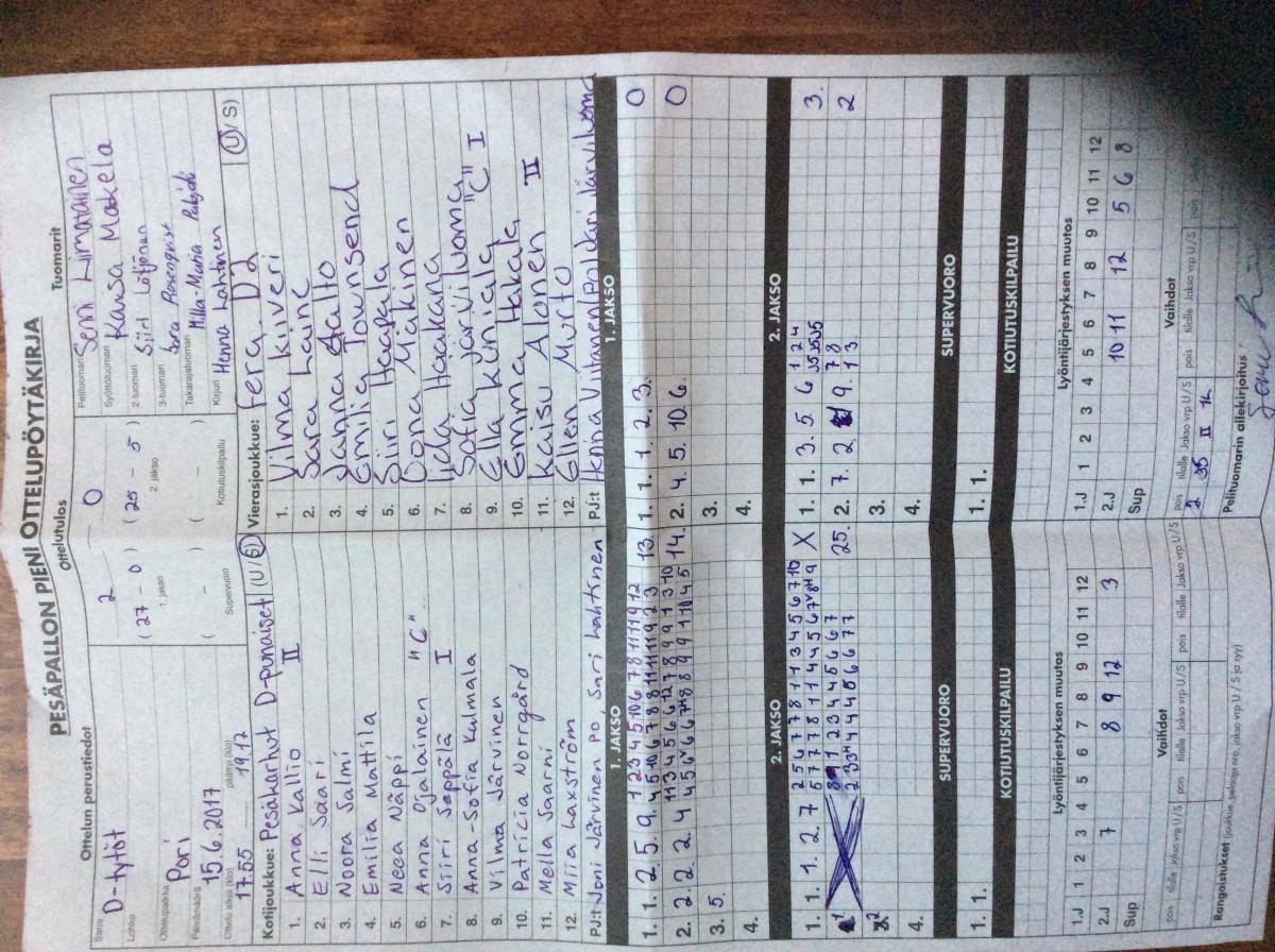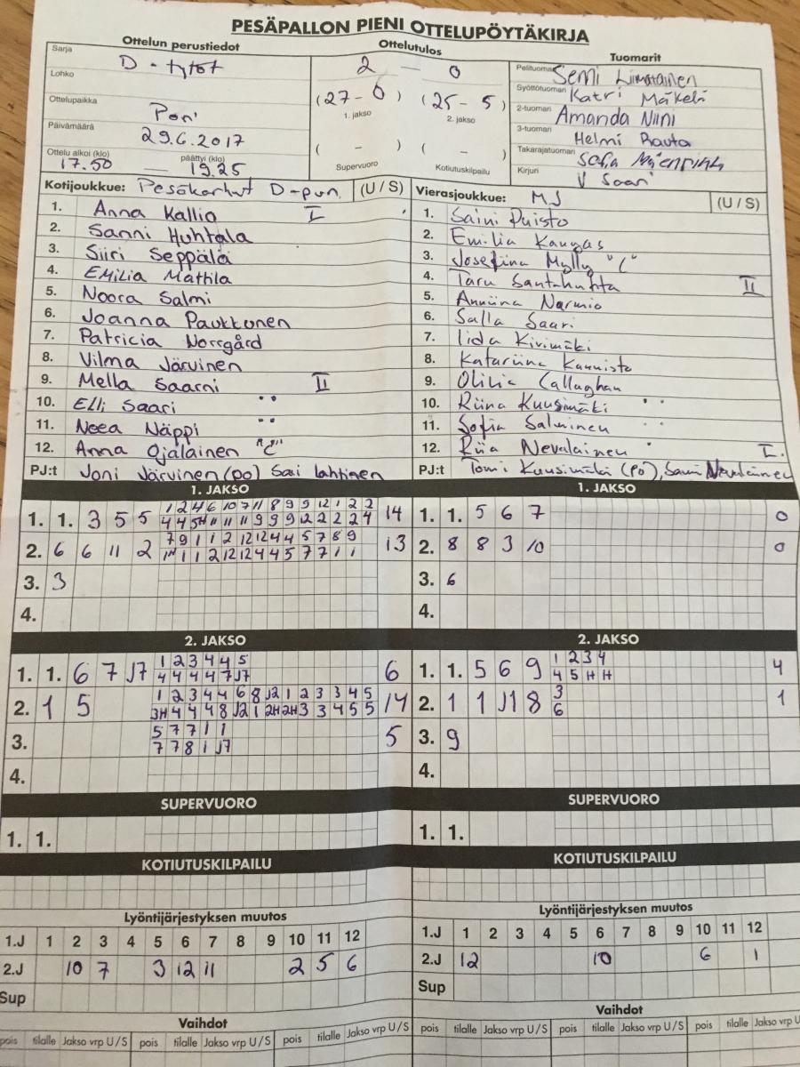 | 29.6.2017 18:00 | Pesäkarhut D-punaiset | MJ-D tytöt | 2-0 (27-0, 25-5) | näytä | |