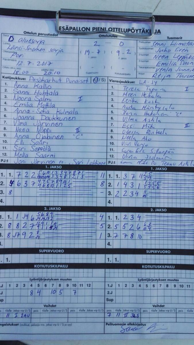 | 12.7.2017 18:00 | Pesäkarhut D-punaiset | Lajy D | 2-0 (19-7, 9-2) | näytä | |