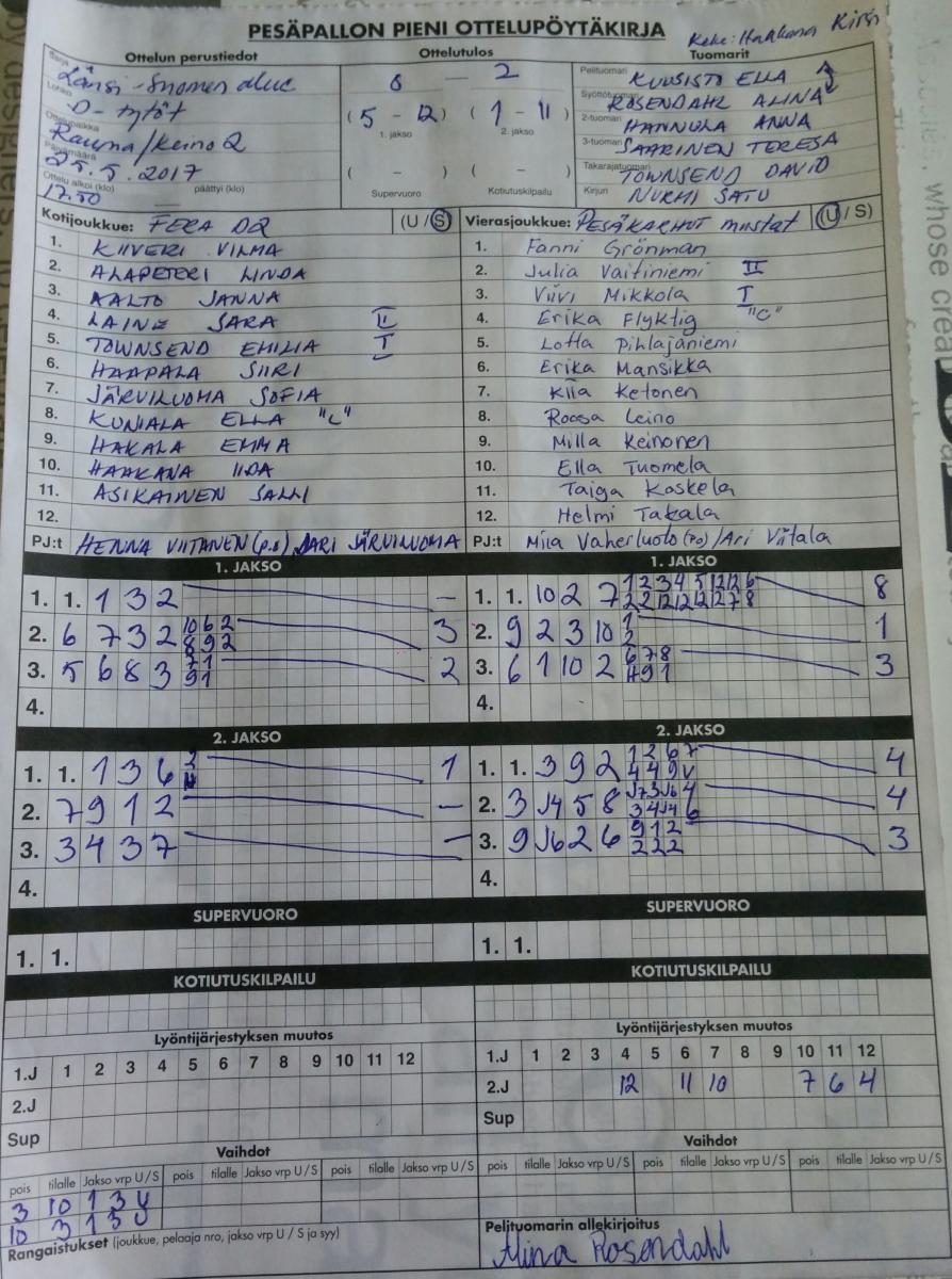 | 15.6.2017 18:00 | Pesäkarhut D-punaiset | Fera D2 | 2-0 (27-0, 25-5) | näytä | |