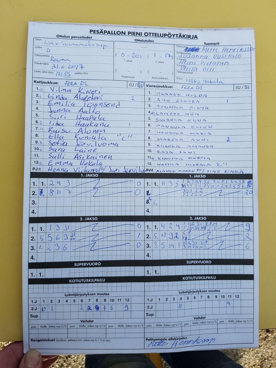 | 21.6.2017 18:00 | Fera D2 | Fera D1 | 0-2 (0-20, 1-17) | näytä | |