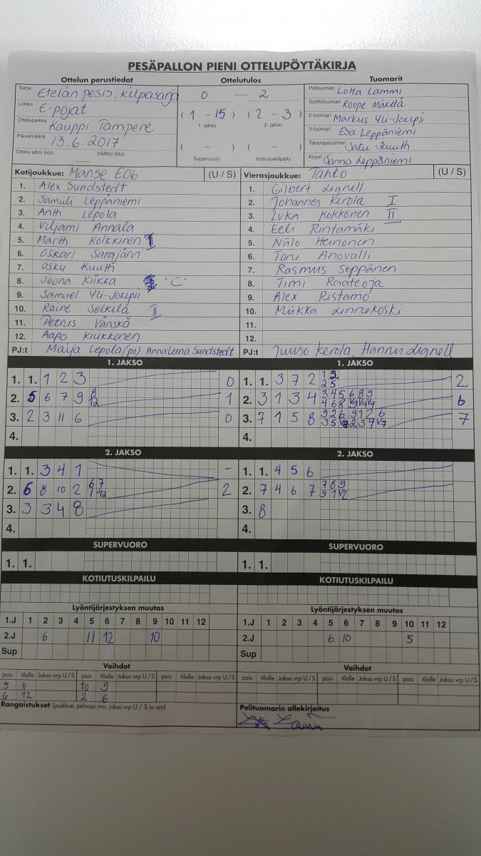 | 5.6.2017 18:00 | Manse PP E-05 | Hyvinkään Tahko E-pojat | 2-0 (23-0, 14-0) | näytä | |