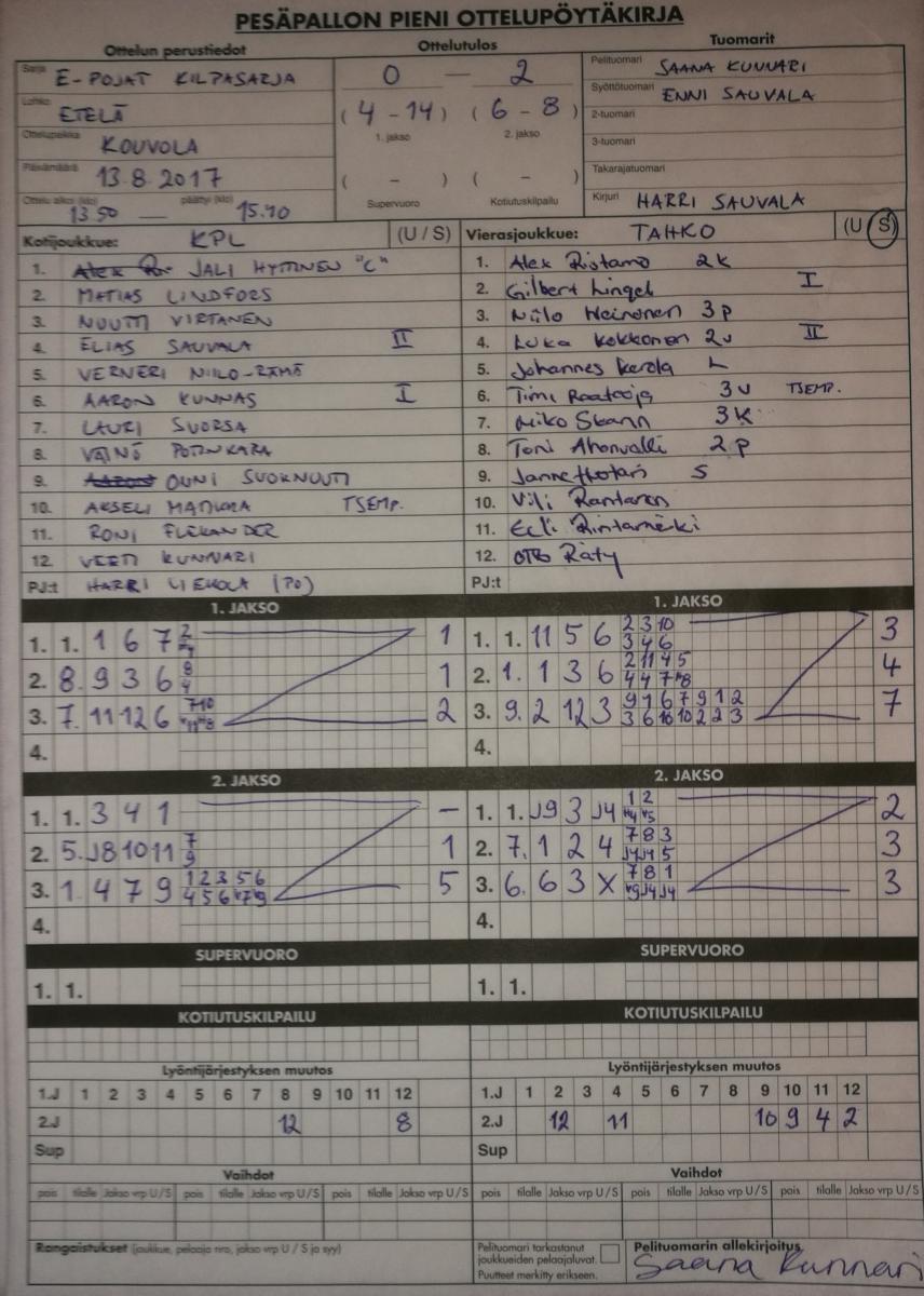 | 3.9.2017 10:00 | Hyvinkään Tahko E-pojat | Hml Paukku | 2-0 (11-8, 6-0) | ||