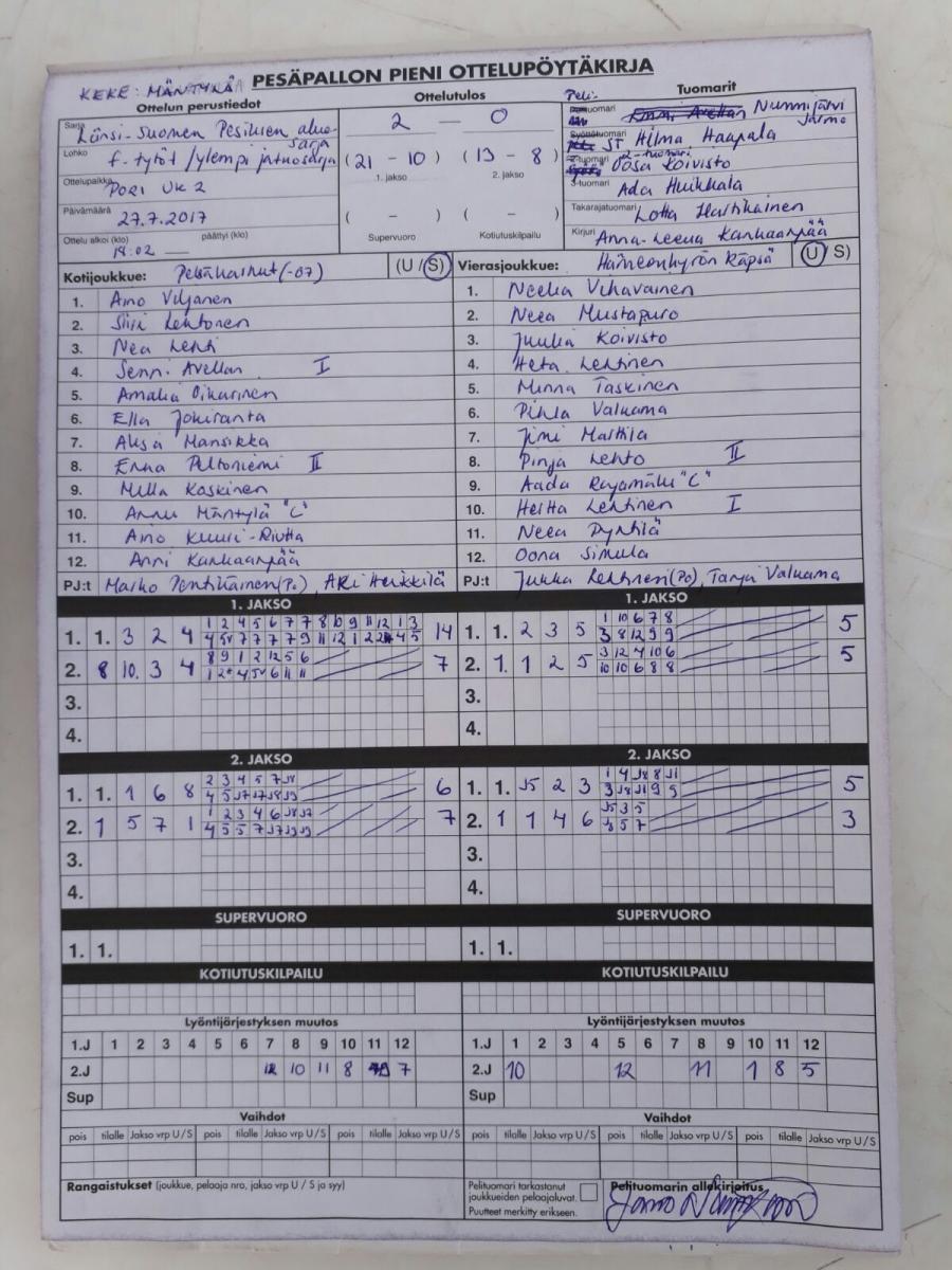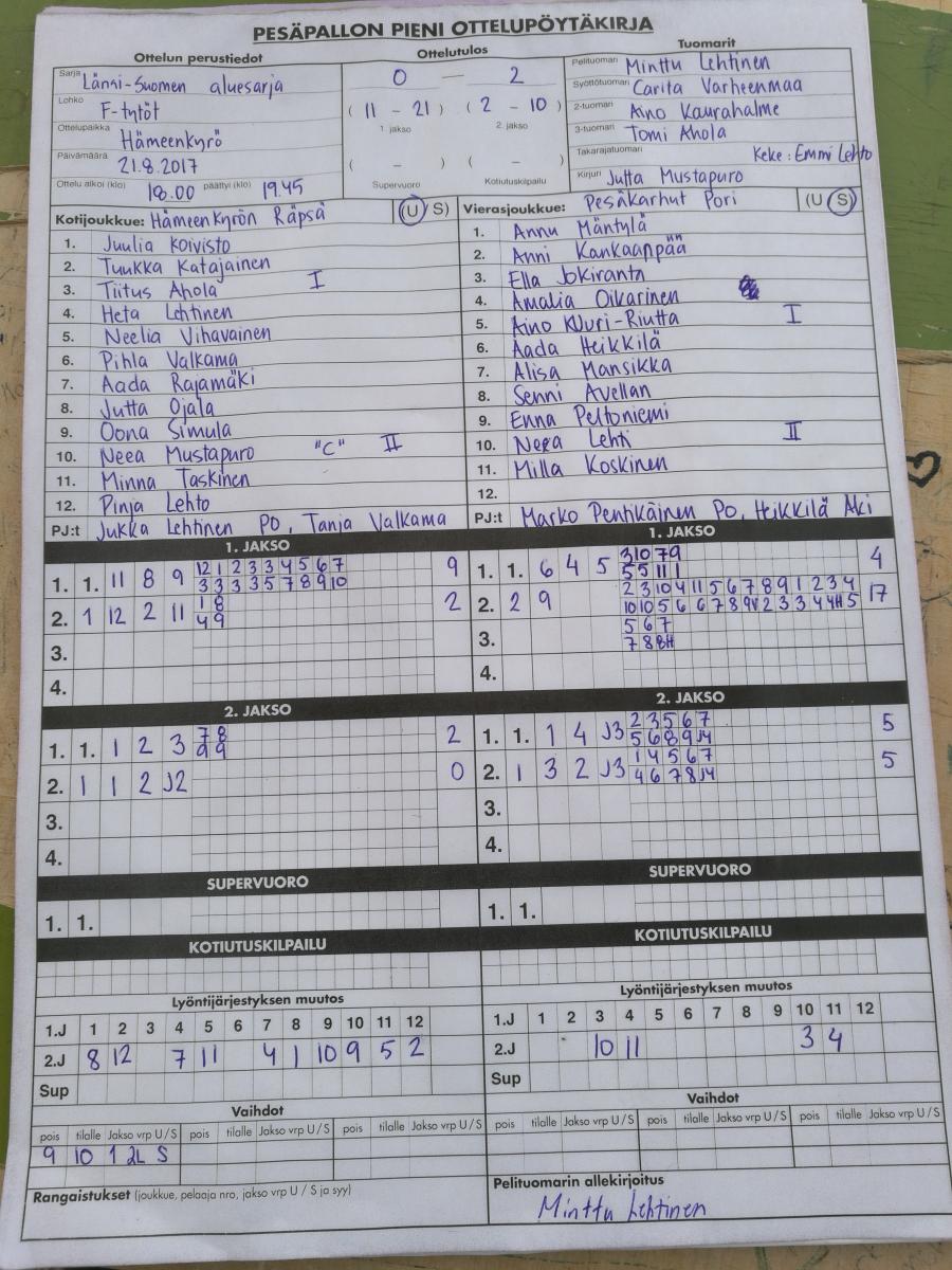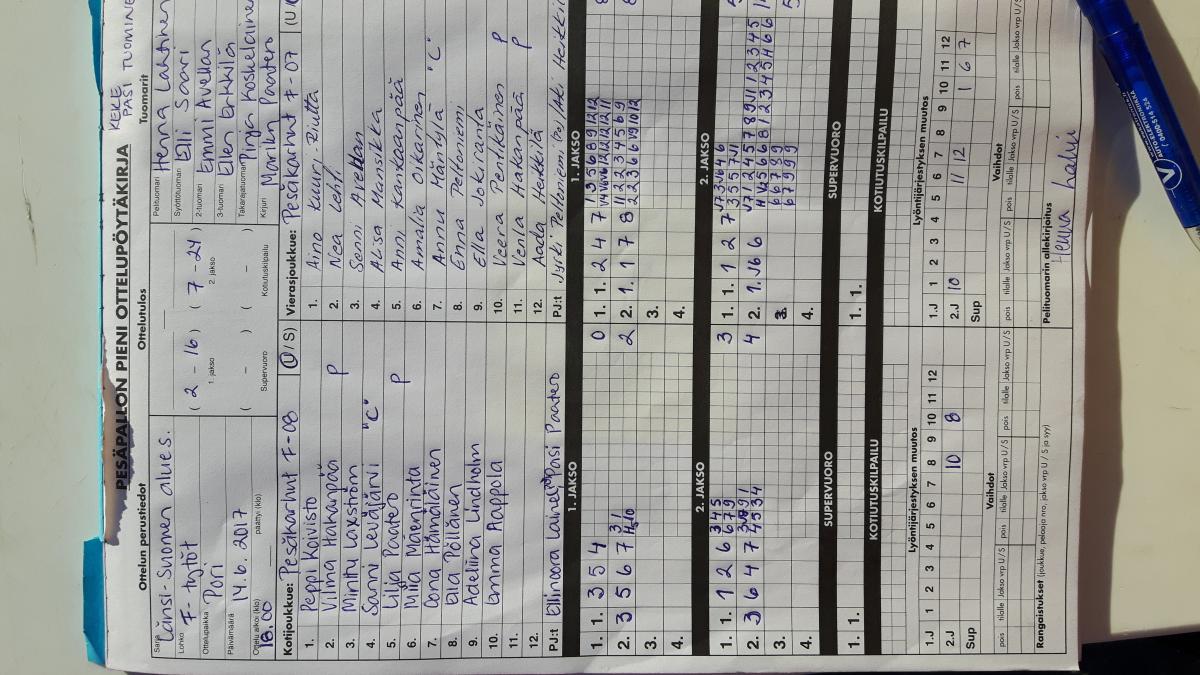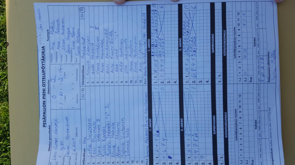 | 27.7.2017 18:00 | Pesäkarhut F07 | Räpsä | 2-0 (21-10, 13-8) | näytä | |