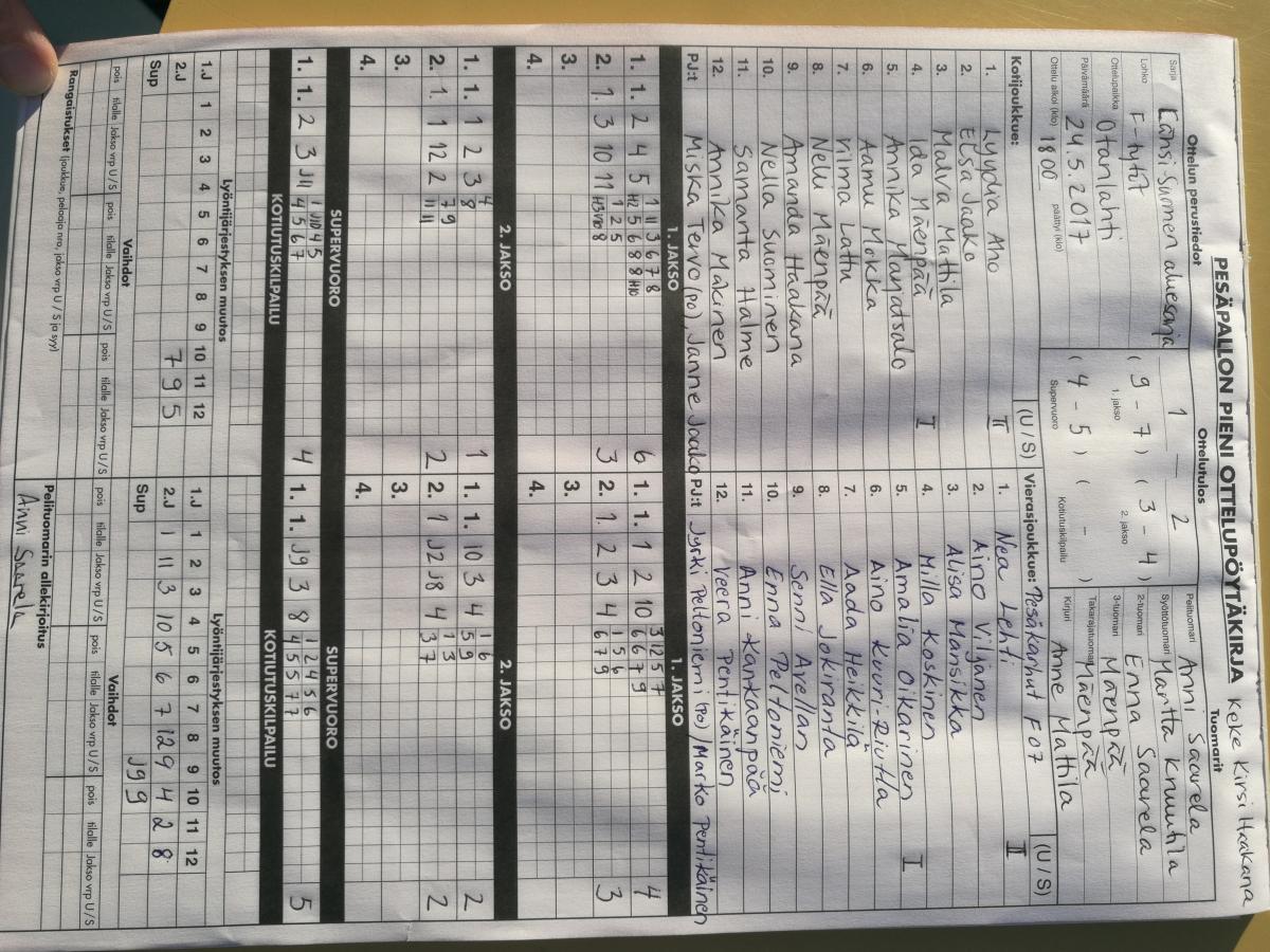 | 14.8.2017 18:00 | Pesäkarhut F07 | Manse PP FT | 2-0 (12-9, 12-7) | näytä | |
