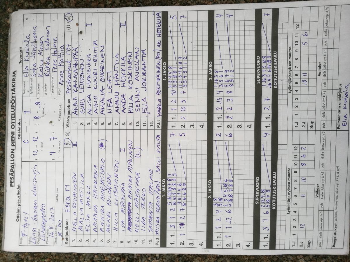 | 16.8.2017 18:00 | Fera F1 | Pesäkarhut F07 | 0-1 (12-12, 8-8, 4-7) | näytä | |
