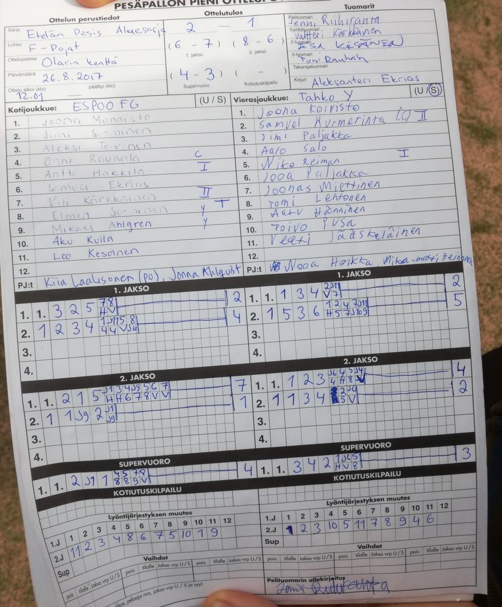 | 26.8.2017 12:00 | | Espoo FG | Tahko FP | 2-1 (6-7, 8-6, 4-3) | näytä |