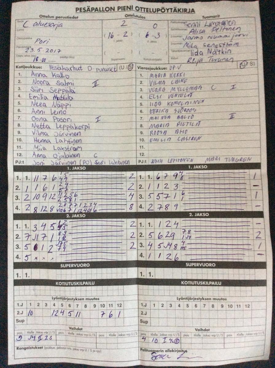 | 23.5.2017 18:00 | Pesäkarhut D-punaiset | UP-V C-Tytöt | 2-0 (16-2, 6-3) | näytä | |