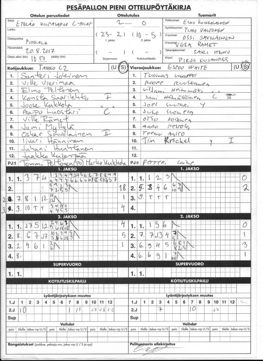 | 15.8.2017 18:00 | Espoon Pesis White | Tahko C1 | 0-2 (0-20, 1-18) | ||