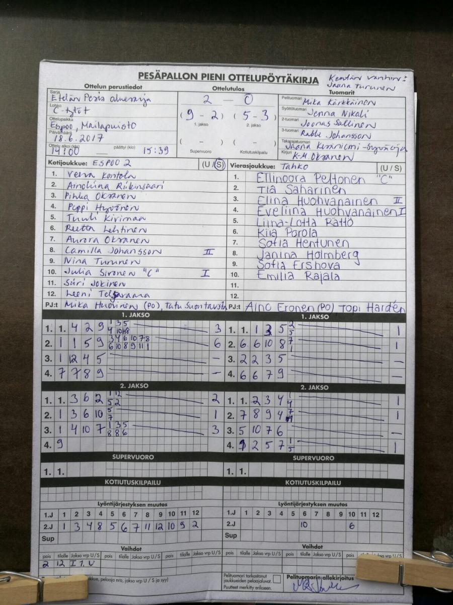 | 18.6.2017 14:00 | Espoo 2 | Tahko CT | 2-0 (9-2, 5-3) | näytä | |