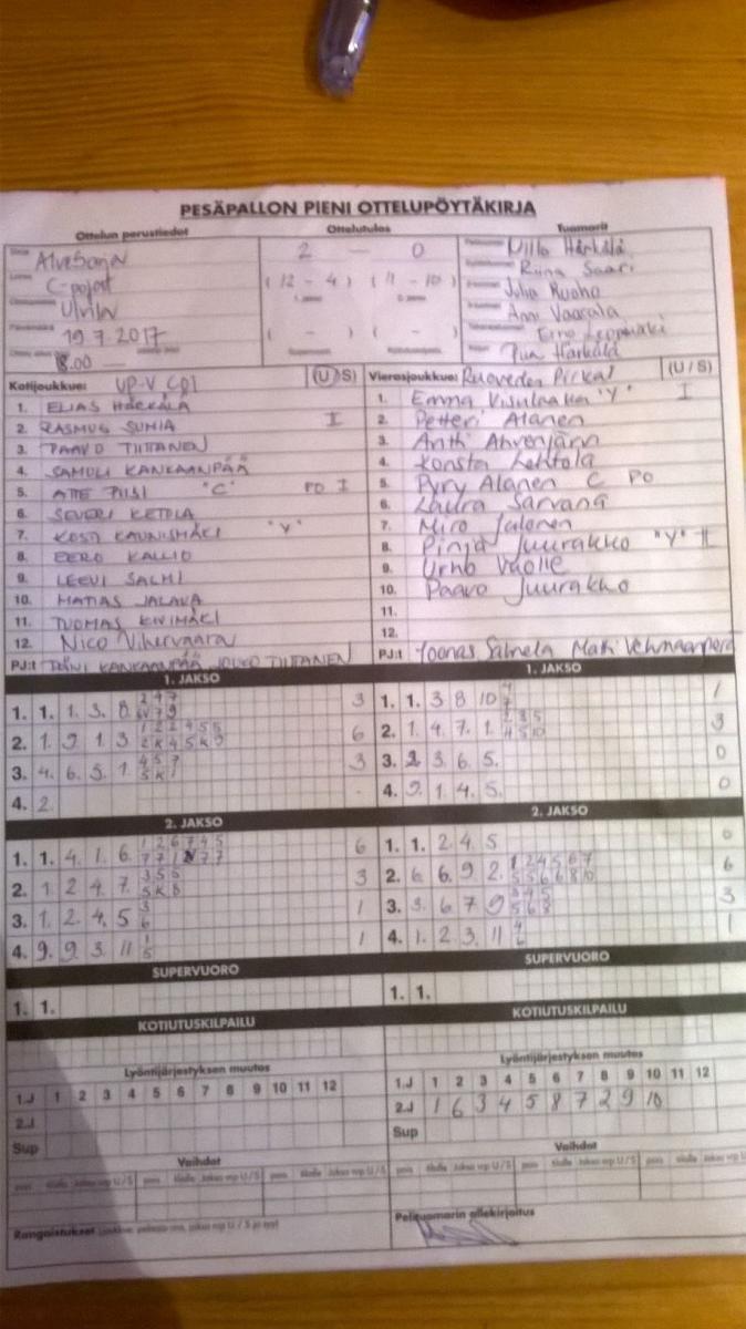 | 3.7.2017 18:00 | EuVe | UP-V Punainen | 2-1 (4-6, 36-0, 7-0) | näytä | |