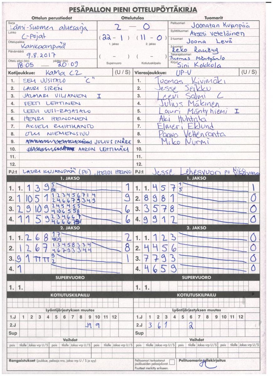 | 9.8.2017 18:00 | KaMa C2 | UP-V Punainen | 2-0 (22-1, 11-0) | näytä |