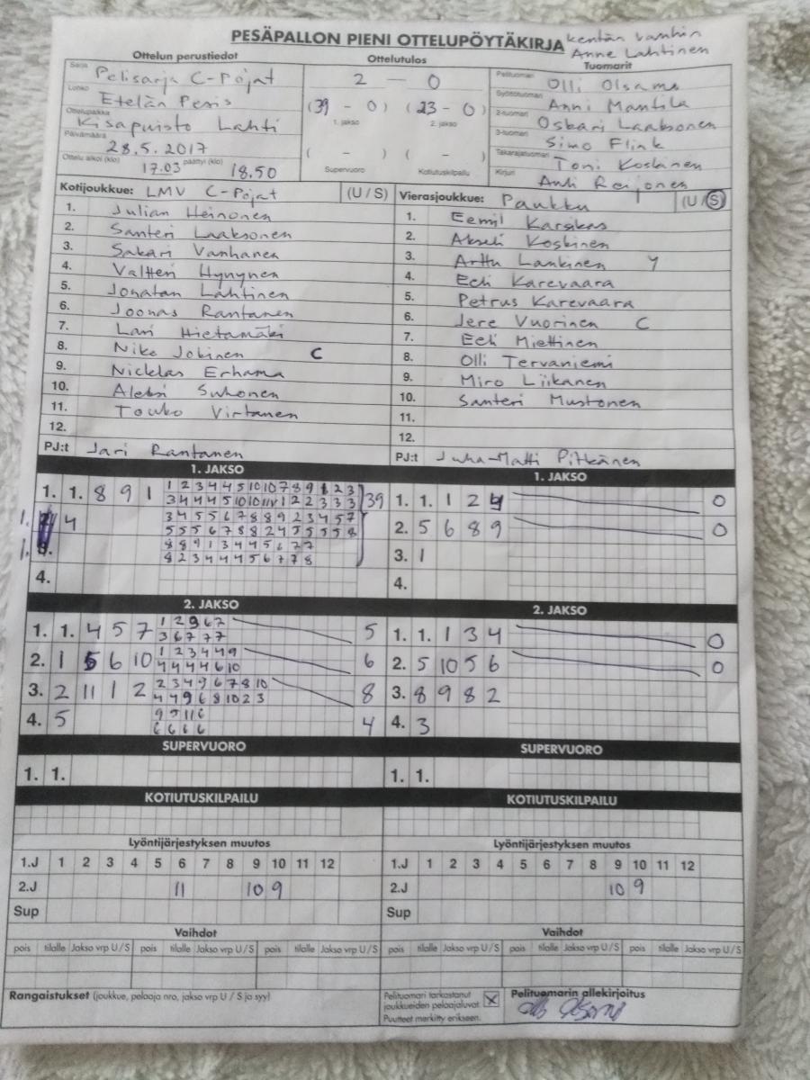 | 28.5.2017 17:00 | LMV C2 | Paukku C-Pojat | 2-0 (39-0, 23-0) | näytä | |